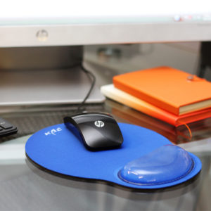 Mouse pad ergonómico con cubierta de plástico y soporte de gel para muñeca.