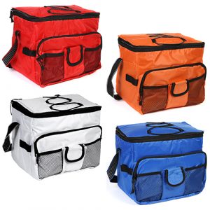 Térmica fabricada en poliéster con interior en polietileno con asa y bolsa al frente.