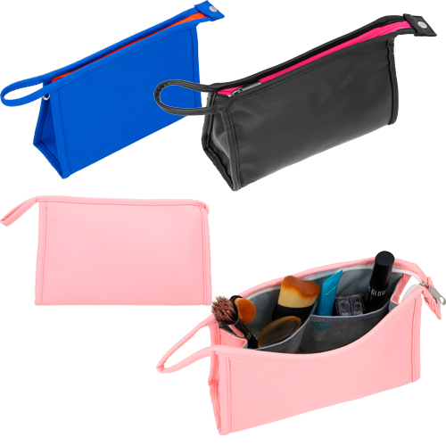 Cosmetiquera con forro. Cuenta con cierre superior y dos compartimentos interiores de malla.