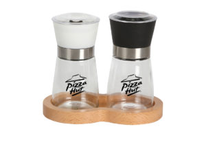 Set de 2 molinos manuales de sal y pimienta o especias con base de bambú. Cuerpo de los molinos de vidrio, tapa plástica y núcleo de acero inoxidable. Agrega el mejor sabor a tus alimentos usando estos novedosos molinos y dale un toque distinguido a tu cocina.