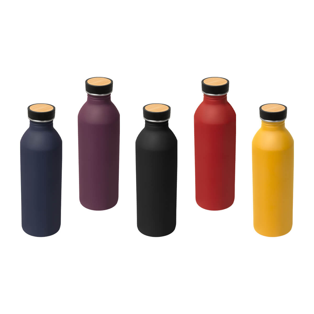 Cilindro metálico de una pared. Tapa de plástico y bambú, su sistema de rosca, permite cerrarlo fácilmente y prevenir derrames. Su cuerpo en terminado mate le agrega un toque elegante. El bambú es un producto