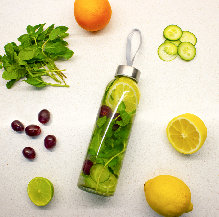 Fabricado en vidrio resistente (Sodocálcico). Cuerpo traslúcido con tapa de acero inoxidable y tira color gris que permite transportarla. Medidas: Ø 6,2 x 23 cm. Capacidad de 500 ml. Métodos de Impresión: Tampografía y serigrafía.