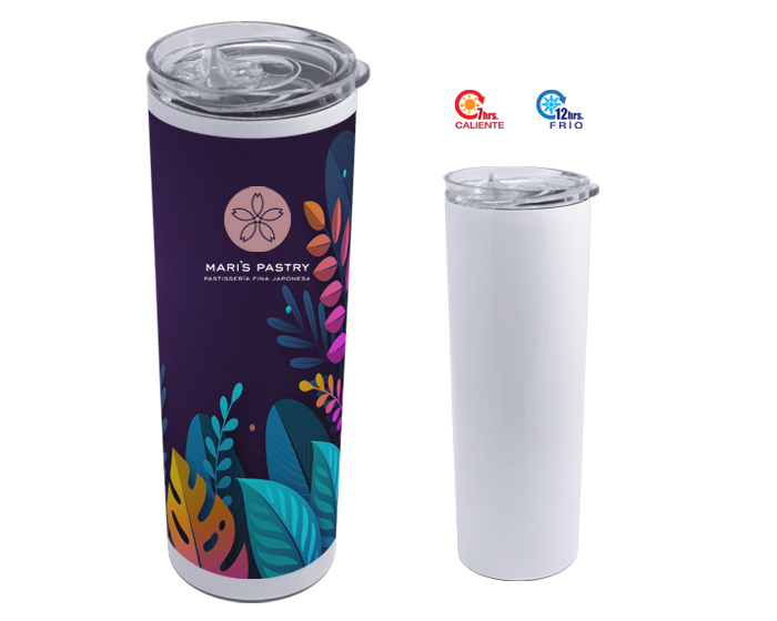Termo para sublimar con doble pared de acero inoxidable insulado al alto vacío el cual permite que las bebidas duren calientes por 7 hrs y frías por 12 hrs. Tapa de plástico a presión con