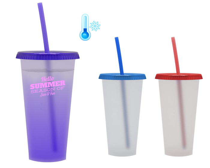 Vaso de plástico con tapa de presión y popote. Cuerpo del vaso cambia al color de la tapa al agregar agua fría. CAP. 700 ml. Medidas: Ø 9.8 x 17.8 cm. Métodos de Impresión: Serigrafía,