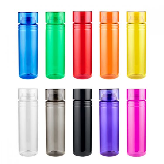 CILINDROS DE COLORES Sistema de rosca twist-off que permite abrir y cerrar la tapa en un giro. Medidas: 7.4 x 24.5 cm. Capacidad: 850 ml. Material: PET. Métodos de Impresión: Tampografía, Serigrafía y Full Color.