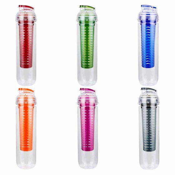 CILINDROS CON INFUSIONADOR Cilindro con infusionador para frutas o bolsas de té. Tapa con sistema de rosca. Medidas: 7 x 28 cm. Capacidad: 800 ml. Material: plástico. Métodos de Impresión: Tampografía y Serigrafía.