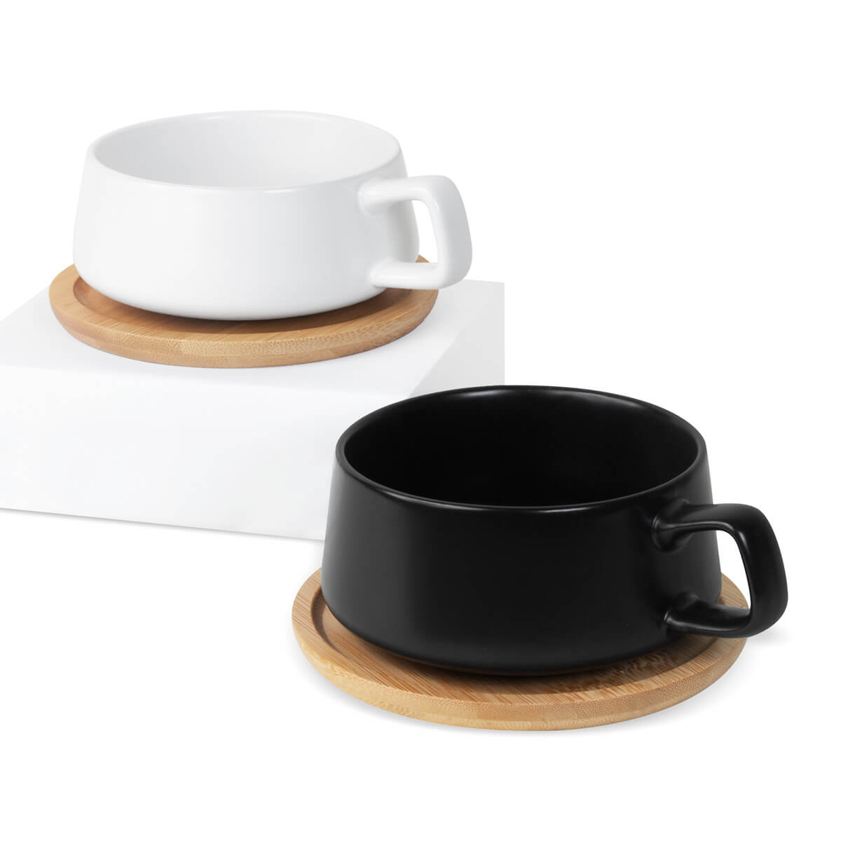 Taza de cerámica con plato de bambú. Terminado mate. Su diseño moderno y minimalista combina funcionalidad con un toque de estilo, convirtiéndola en el complemento perfecto para tu cocina, oficina o espacio personal. Incluye caja