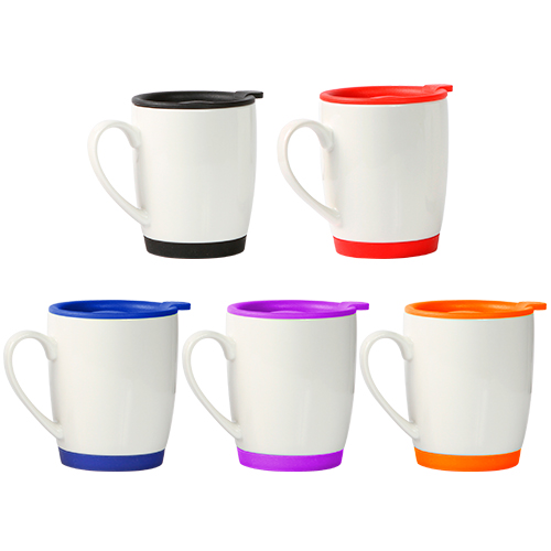 TAZA DE CERÁMICA CON TAPA Y BASE Con tapa y base de silicón. Disponible en colores azul, morado, negro, naranja y rojo. Capacidad 300 ml. Métodos de Impresión: Serigrafía y Tampografía.