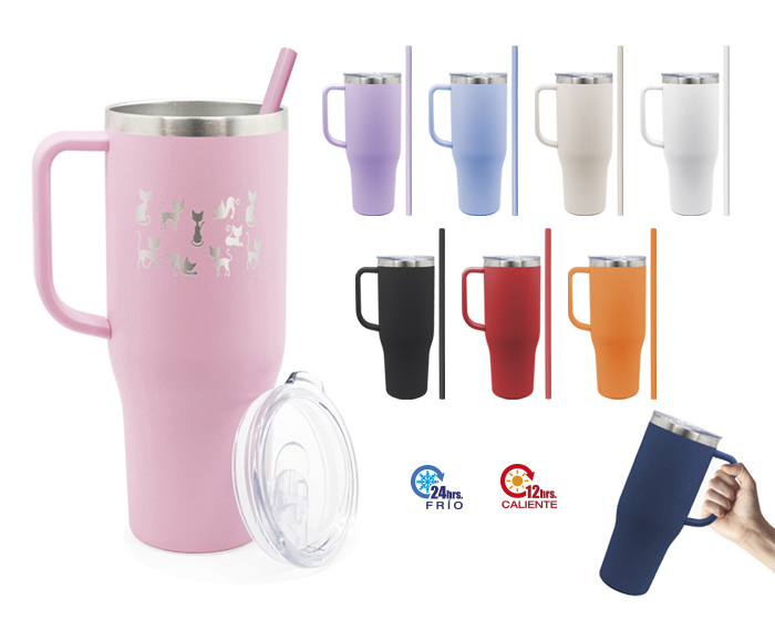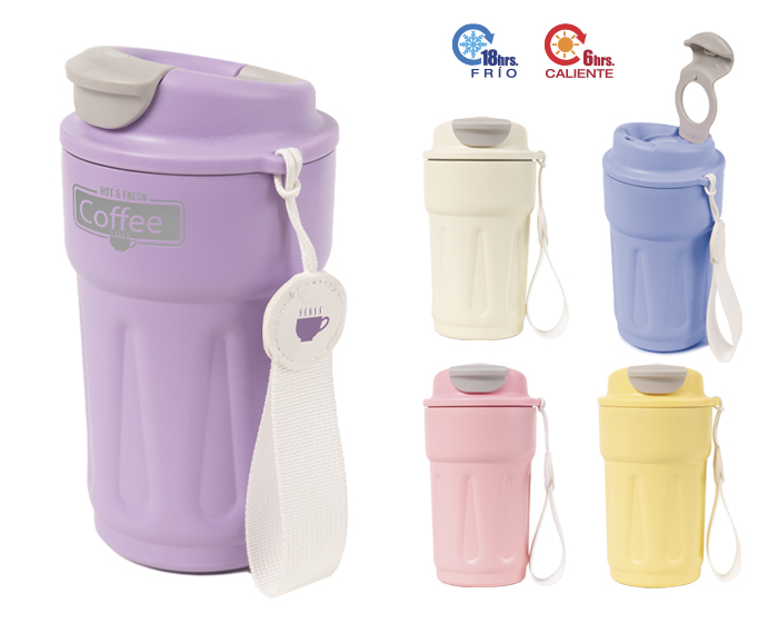 Termo de doble pared insulado al alto vacío, mantiene la temperatura caliente por 12 horas y fría por 24, cuenta con acabado de polvo plástico. La parte inferior es más angosta para poder ser usado
