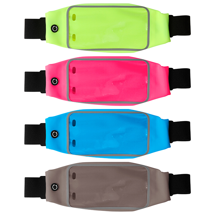 CANGURERA PARA CELULAR Cinturón deportivo ajustable, con compartimento para celular y salida para audífonos. Medidas: 10 x 35 cm. Material: Tela y plástico. Métodos de Impresión: Serigrafía, Bordado y Vinil Textil.