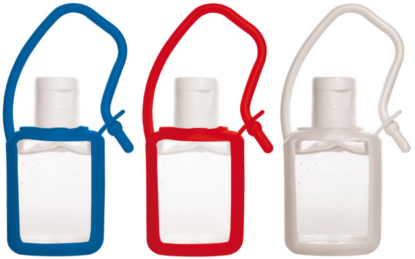 GEL ANTI BACTERIAL CON FUNDA Funda de silicona con sistema de enganche para colgar. Incluye el gel. Medidas: 3 x 6.5 x 1 cm. Material: Silicon. Métodos de Impresión: Tampografía.