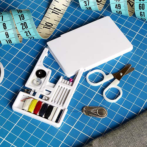 SET DE COSTURA Costurero (Tapa deslizable. Incluye tijeras, botones, ensartador de aguja, alfiler, hilo, agujas y seguro.) Medidas: 5.3 x 8.8 cm. Material: plástico. Métodos de Impresión: Tampografía y Full Color.