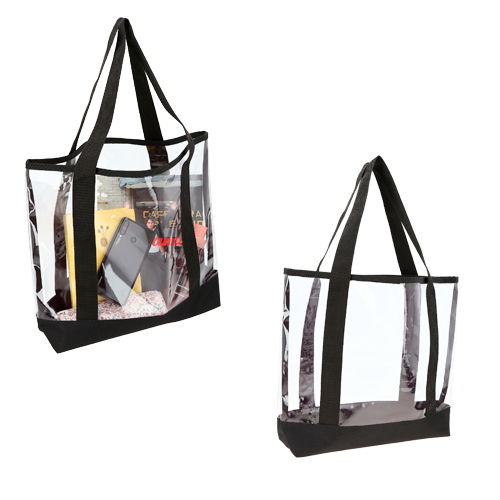 Bolsa plástica transparente con asas y base de poliéster. Medidas: 34 x 34 x 10 cm. Métodos de impresión: Serigrafía.