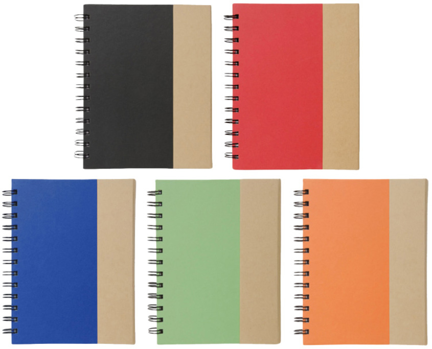 CUADERNO DE CARTON Cuaderno de cartón con espiral. Dos autoadhesivos rectangulares (grande y mediano), cinco autoadhesivos señaladores de diferente color y bolígrafo de cartón con pulsador, clip y punta plásticos de color. 70 Hojas rayadas. Cierre