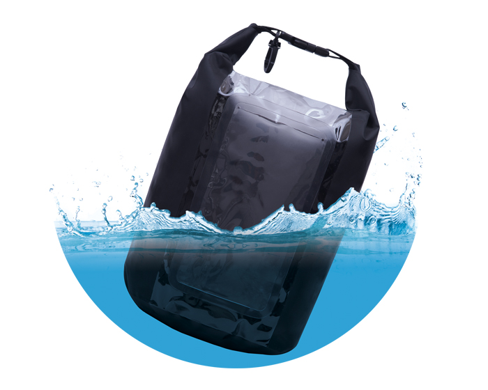 BOLSA REPELENTE Bolsa repelente al agua, con un compartimento ideal para ropa, compartimento plastificado para teléfonos móviles o accesorios electrónicos. La parte superior se enrrolla de 2 a 3 veces para cerrar y se ajusta