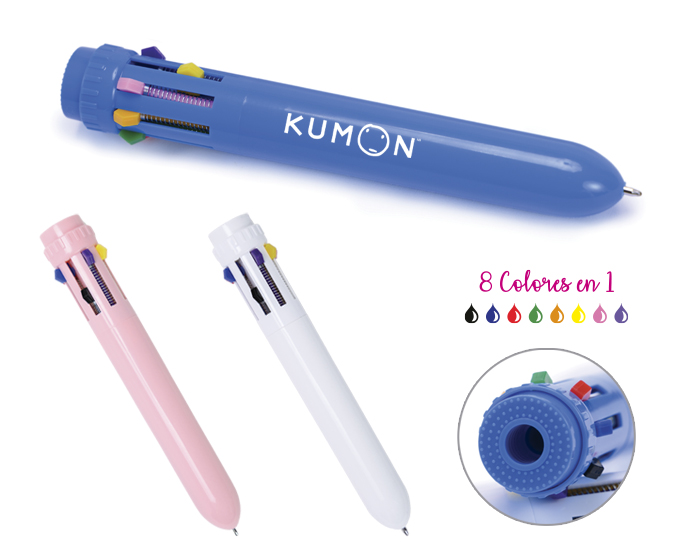Bolígrafo de plástico multitintas, incluye 8 colores de tinta diferentes. PRODUCTO Material Plástico Medidas 12.3 x 1.7 cm Empaque individual Bolsa de Plástico