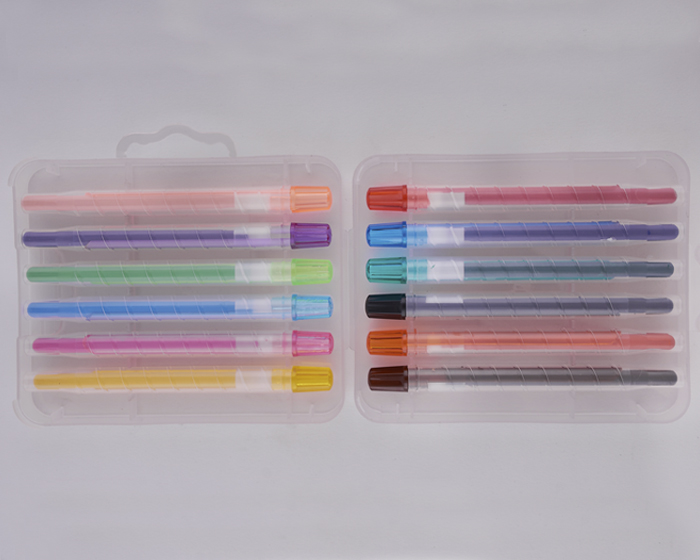CRAYOLAS TIPO PLUMÓN Estuche rígido transparente de 12 crayolas tipo plumón en diferentes colores. Al girar la tapa superior, la punta de la crayola se desliza y queda lista para iluminar, dibujar o escribir. El
