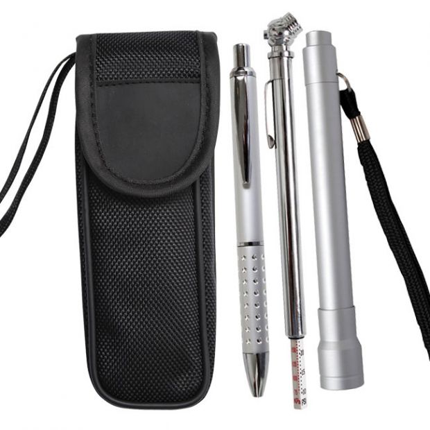 HERRAMIENTAS SET VIAL Set de herramientas para vialidades. Incluye linterna, calibrador, pluma y estuche. Medidas: Linterna 14 x 1.8 cm Boligrafo 13.5 x 1 cm Calibrador 14 x 1 cm Estuche 16 x 6 x 2
