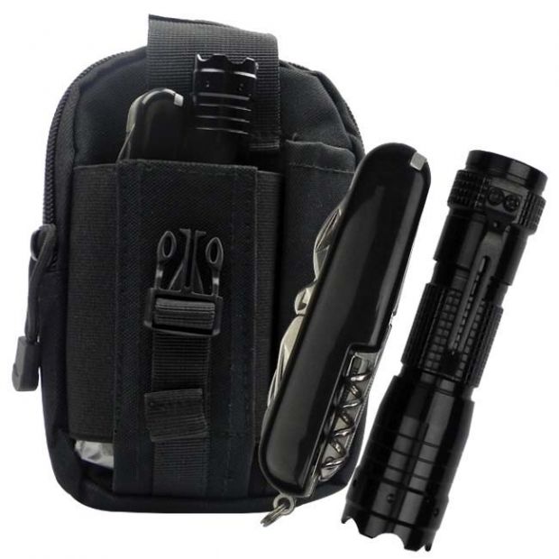 KIT DE SUPERVIVENCIA BÁSICO Set de 3 piezas, incluye: estuche con llavero arnés, navaja Multi-funcional y linterna. Medidas: 13 x 8.5 x 3.5 cm. Material: Estuche de PU