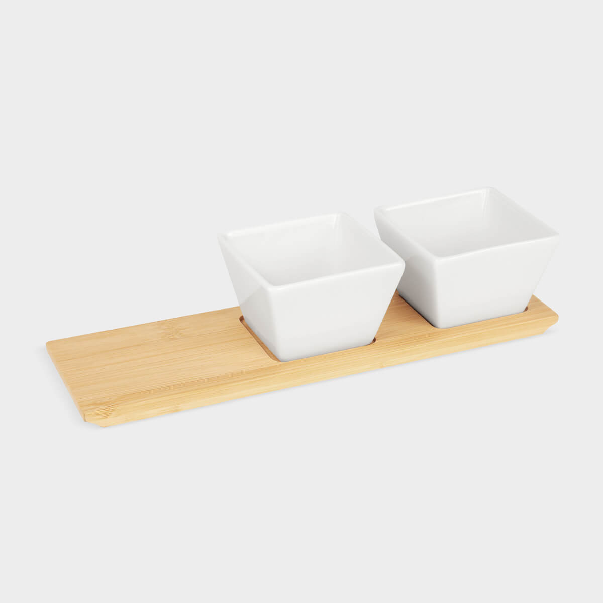Botanero con base de bambú y dos contenedores de cerámica. Perfectos para servir botanas, dips o salsas con estilo. Ideal para reuniones, cenas o cualquier ocasión donde el diseño y la practicidad se encuentren. Incluye