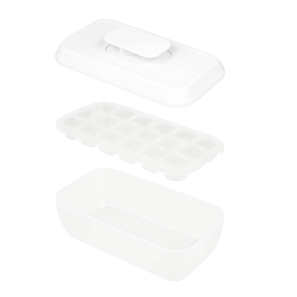 Molde para hielos con almacenamiento integrado. Crea hasta 18 cubitos y desmóldalos fácilmente con el sistema push de la tapa. Gracias a su contenedor integrado, puedes almacenar el hielo listo para usar sin ocupar espacio