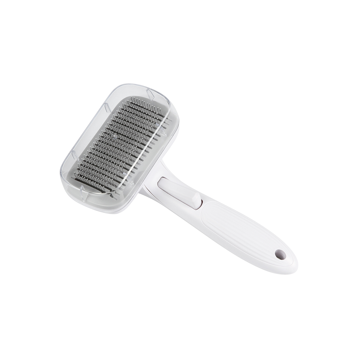 Cepillo removedor de pelo para mascota, con cubierta protectora y detalles a color, bastante práctico y fácil de transportar. Cuenta con un botón de Autolimpieza con el que al presionarlo oculta las cerdas de acero y remueve el pelo del