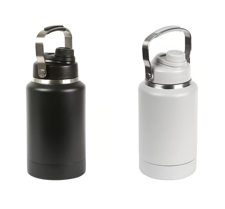 Cilindro doble pared fabricado en acero inoxidable 604, tapa de seguridad de rosca con boquilla. Capacidad de 1,800 ml. Incluye caja de color individual y asa metálica para transportar, peso 1,150 g. Medidas: 13.5x28.5 cm.