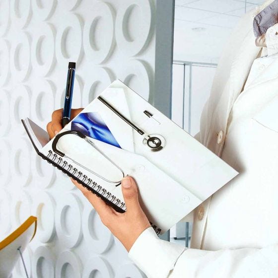 LIBRETA DE DOCTOR 100 hojas de raya. Con espiral metálico doble y elástico para bolígrafo. Medidas: 17.2 x 21.5 cm. Material: cartón. Métodos de Impresión: Serigrafía.