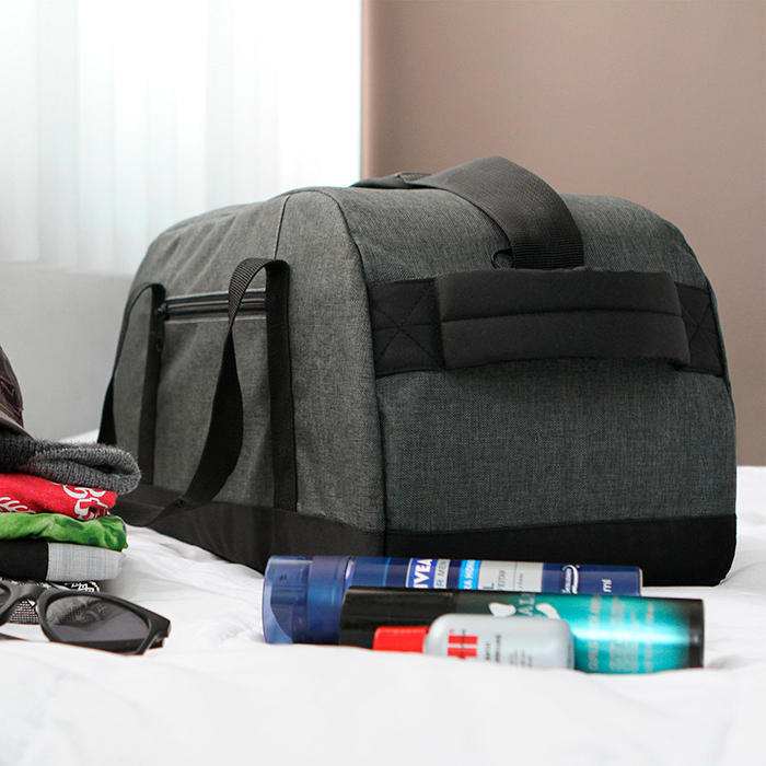 MALETA DEPORTIVA Maleta deportiva fabricada en poliéster color gris, con cierre al frente y correa de hombro regulable. Medidas: 26 x 54 cm Material: Poliéster. Métodos de Impresión: Bordado, Serigrafía y Vinil textil.