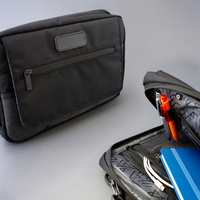 MALETÍN Maletín negro de tela. Combinación de materiales de alta resistencia repelentes al agua. Multi compartimentos frontales cubiertos con solapa que cierra con velcro. El frente cuenta con un práctico bolsillo extra. Compartimento principal con apertura