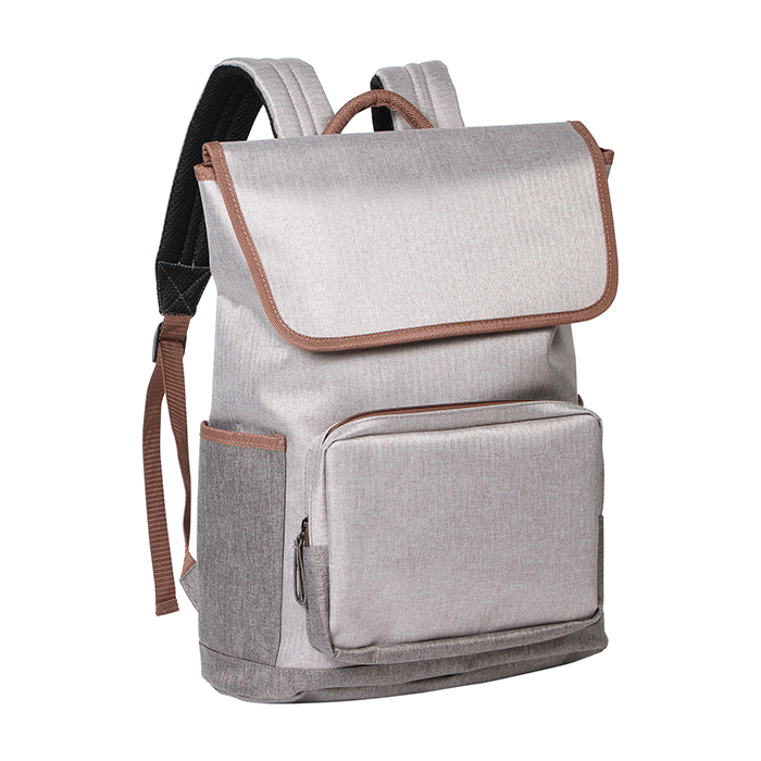 MOCHILA BI TONO Mochila bi-tono, fabricada en poliéster con bolsa al frente y detalles en color café. Medidas: 45 x 35 cm. Material: Poliéster. Métodos de Impresión: Serigrafía, Bordado y Vinil Textil.