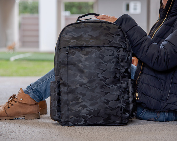 BACK PACK Mochila tipo backpack porta laptop de 15.6 pulgadas con diseño de camuflaje con dos compartimentos y bolsas laterales. Interior acolchado con compartimentos para accesorios. Correas acolchadas ajustables con porta lentes y bolsa para