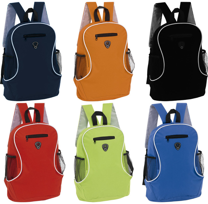 MOCHILA 16 LITROS Fabricada en polyester 600D. Compartimento principal y pequeña bolsa frontal con cierre. 2 Bolsas laterales de red. Salida para audífonos. Medidas: 40 x 29 x 17.5 cm. Métodos de Impresión: Serigrafía, Vinil Textil