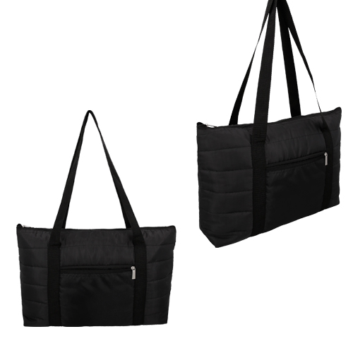 Bolsa de nylon con interior reforzado, dos asas y compartimento frontal. Medidas: 32 x 50 x 9.5 cm. Métodos de Impresión: Serigrafía, bordado y vinil textil.