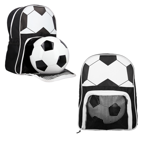 Mochila con temática de futbol y porta balón en forma de portería. Medidas: 40 x 32.5 x 14 cm. Métodos de Impresión: Serigrafía.