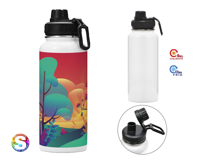 Termo de doble pared para sublimación insulado al alto vacío. Mantiene las bebidas frías por 12 hrs. y calientes por 6 hrs. Tapa de rosca con boquilla y asa para sujetarlo fácilmente. CAP. 1,200 ml.