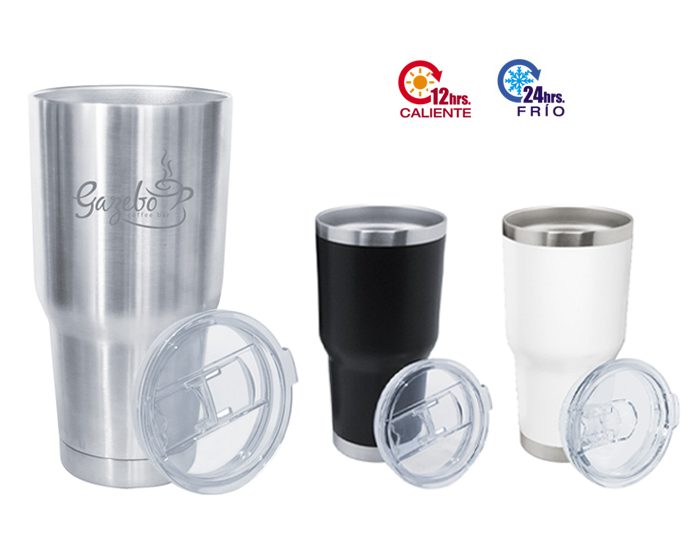 Termo para auto con doble pared de acero inoxidable insulado al alto vacío con capa interior de cobre. Conserva el frío por 24 hrs. y el calor por 12 hrs. Incluye tapa transparente de cierre