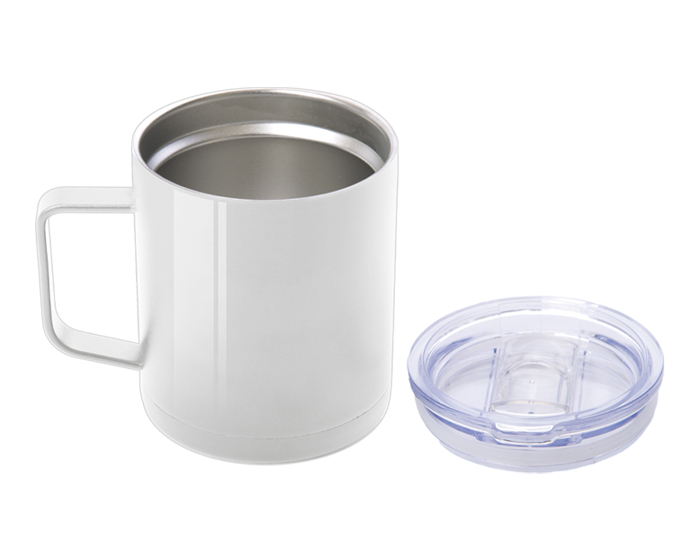 Mug sublimable de doble pared. Interior de plástico PP y exterior de acero 201. Tapa plástica transparente a presión con anillo de silicona. Pintura acabado semimate. Base negra antideslizante. Medidas: Ø 8,8 cm x 12,5