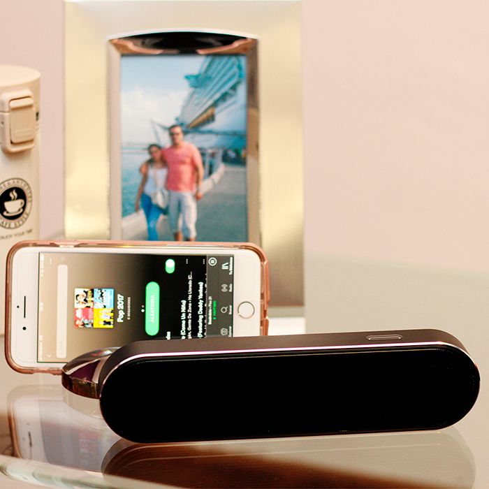 BOCINA METÁLICA Bocina metálica recargable con bluetooth 4.0, batería de 2000 mah, duración hasta 16 h, tiempo de carga 3.5 h y micrófono integrado. Medidas: 5.5 x 22 cm. Material: Metal. Métodos de Impresión: Tampografía, Serigrafía