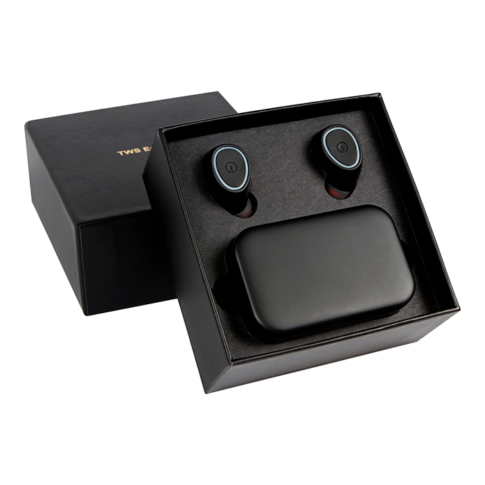 AUDÍFONOS INALÁMBRICOS BLUETOOTH Audífonos inalámbricos bluetooth color negro, luz led y estuche rectangular para carga. Medidas: 4.3 x 6.5 cm. Material: Plástico. Métodos de Impresión: Tampografía.