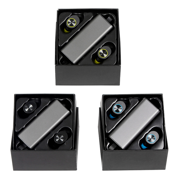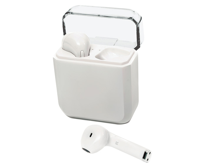 AUDÍFONOS CON ESTUCHE METÁLICO Audífonos inalámbricos bluetooth con estuche metálico rectangular para carga. Medidas: 8.2 x 3.2 cm. Material: Metal. Métodos de Impresión: Tampografía, Full Color y Grabado Láser.