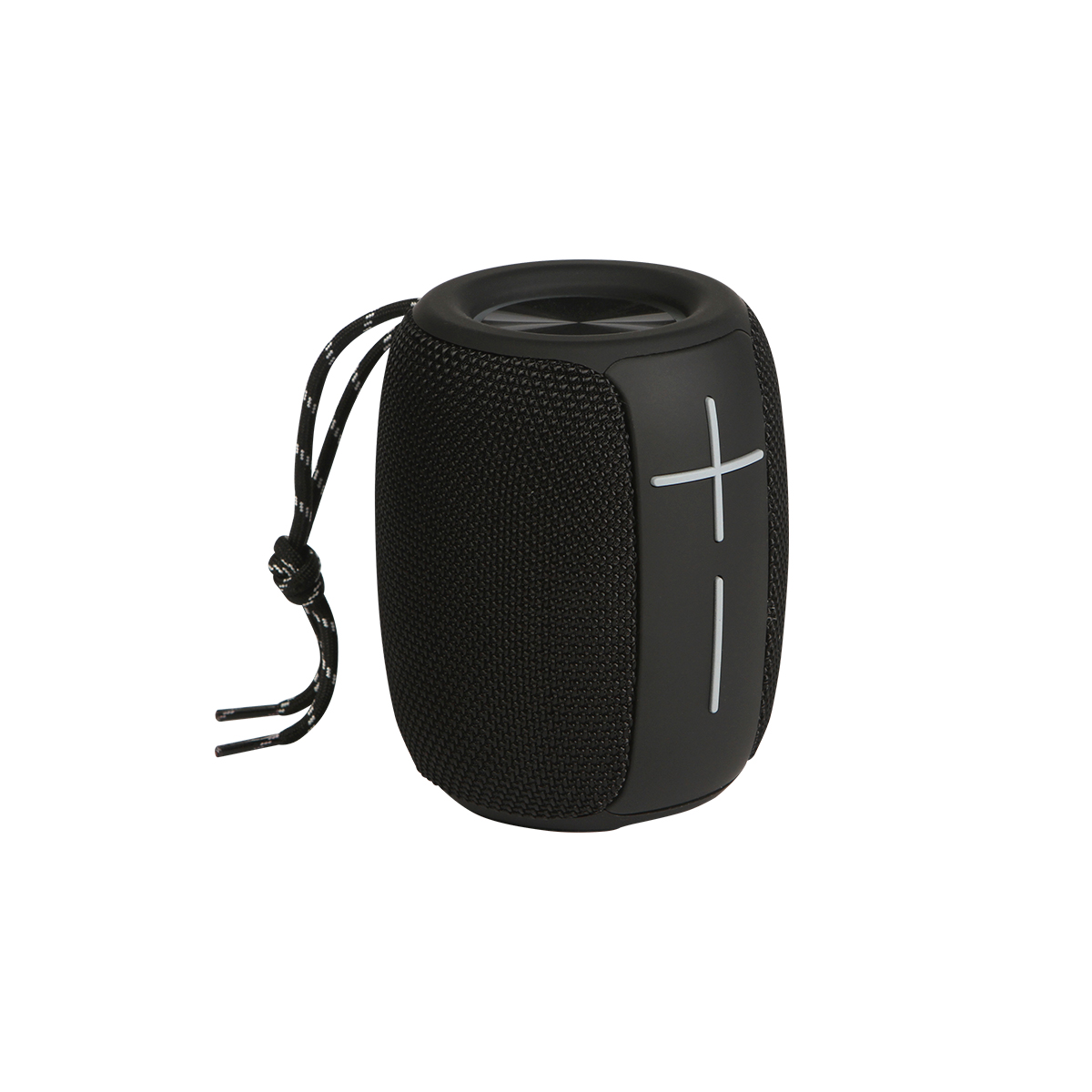 Bocina bluetooth a prueba de agua fabricada en plástico ABS y metal, con cubierta de tela, acabado mate, cordón y luz RGB 3 modos, dispositivo manos libres, radio FM con sintonizador, ranura para tarjeta TF, ranura USB e IPX4