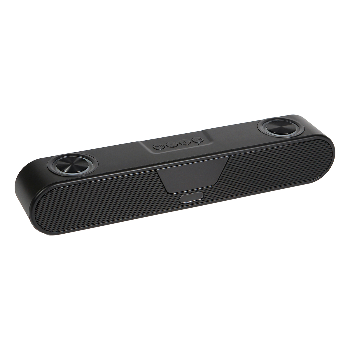 Bocina bluetooth con radio FM, entrada para tarjeta TF y memoria USB, fabricada en plástico ABS con cubierta de tela y soporte para celular en la parte superior. En la parte inferior se encuentran 4 botones para manipular