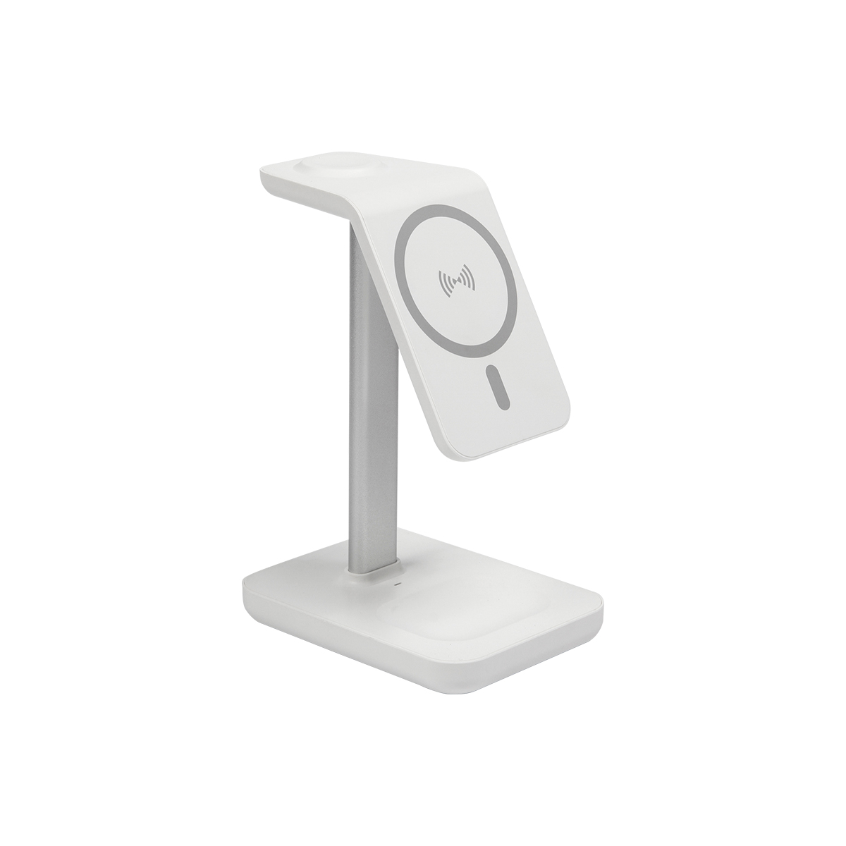 Cargador inalámbrico 3 en 1 fabricado en plástico ABS y metal, carga a través de cable USB (incluido). Apto para dispositivos con tecnología Qi. Cuenta con varios espacios de carga lo que te permite cargar tu celular, audífonos y reloj al mismo