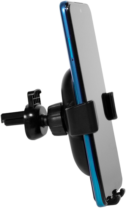Porta celular con botón en la parte trasera que presionándolo se engancha en la ventilación del aire acondicionado del auto. El celular se apoya sobre 3 brazos que se ajustan para obtener una buena sujeción.