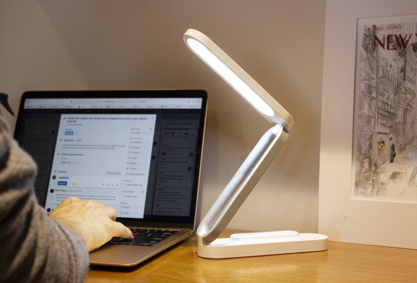 Lámpara plegable con detalles de color gris en el interior. Botón que cambia la intensidad de la luz al presionarlo. Se encenderá una luz roja cuando la bateria no esta cargada al 100%, que pasará