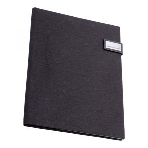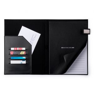 Carpeta ejecutiva Antonio Miro, fabricada en nylon 1200 d/ polipiel, con compartimentos interiores, porta tarjetas y block de 50 hojas tamaño carta.