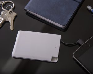 Batería portátil de capacidad 2500 mAh para dispositivos móviles. Incluye adaptador para iPhone y cable para carga