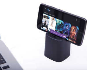Bocina Bluetooth con manos libres, ranura para colocar el teléfono en la bocina. Botón de encendido y cable de carga.