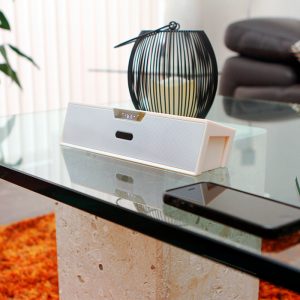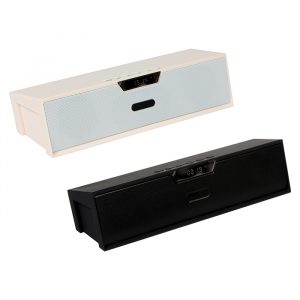 Bocina recargable bluetooth, reloj, alarma, batería de litio (duración 12 horas), pantalla LCD, responde llamadas con la función de manos libres, entrada de micro SD/USB y radio FM.